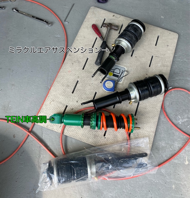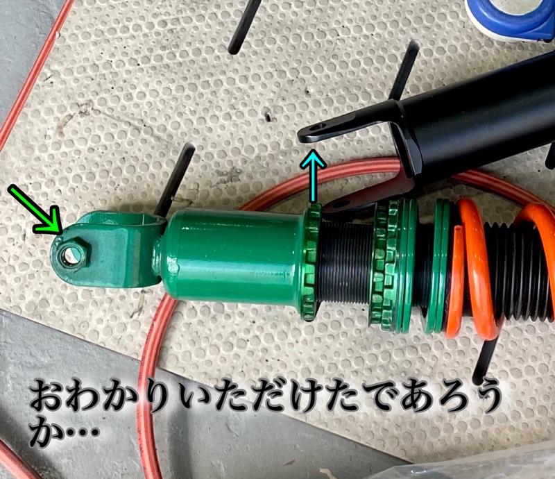 黒色が今回取り付けるエアサスペンション、グリーンがもともとついてたTEINの車高