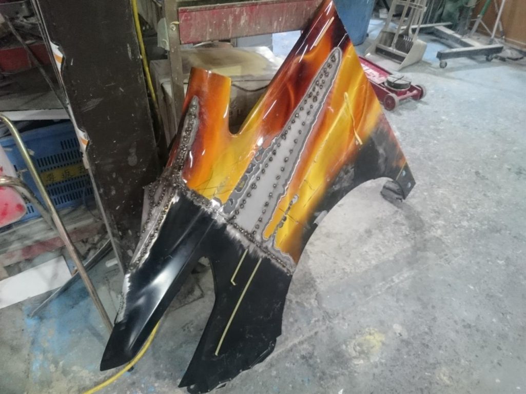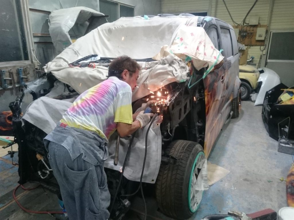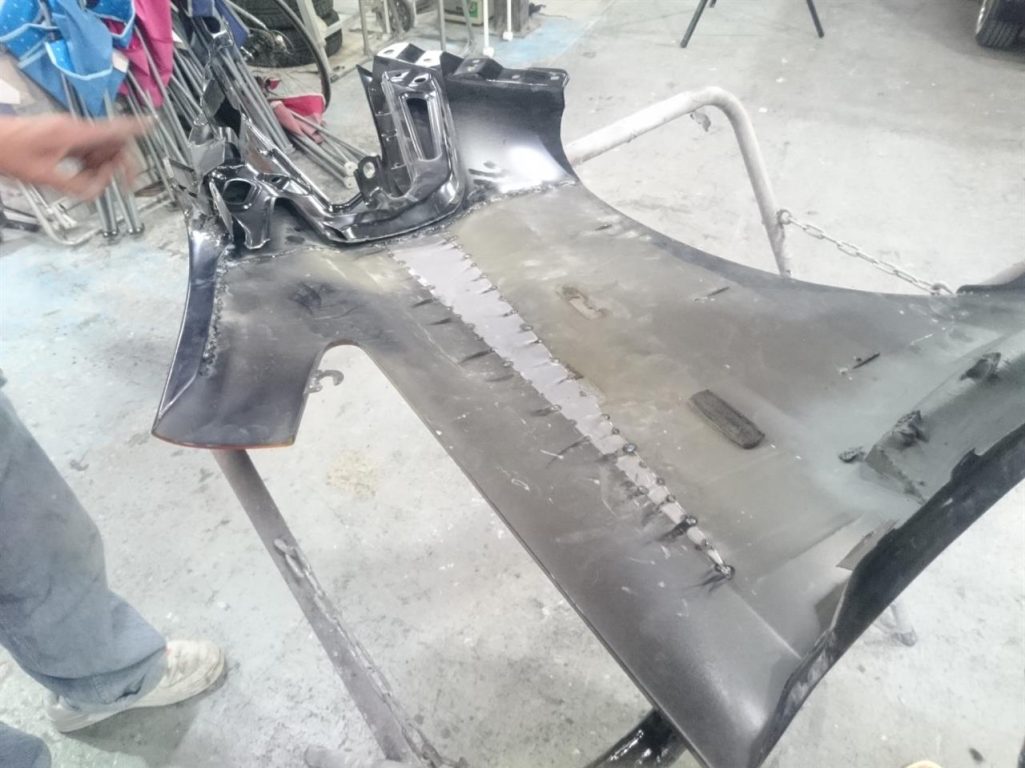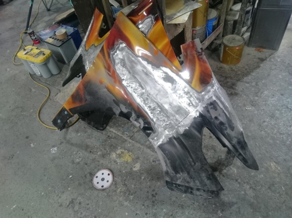 フェンダー・ボンネットの加工もほぼ終わり、取り外して仕上げに入ります!!