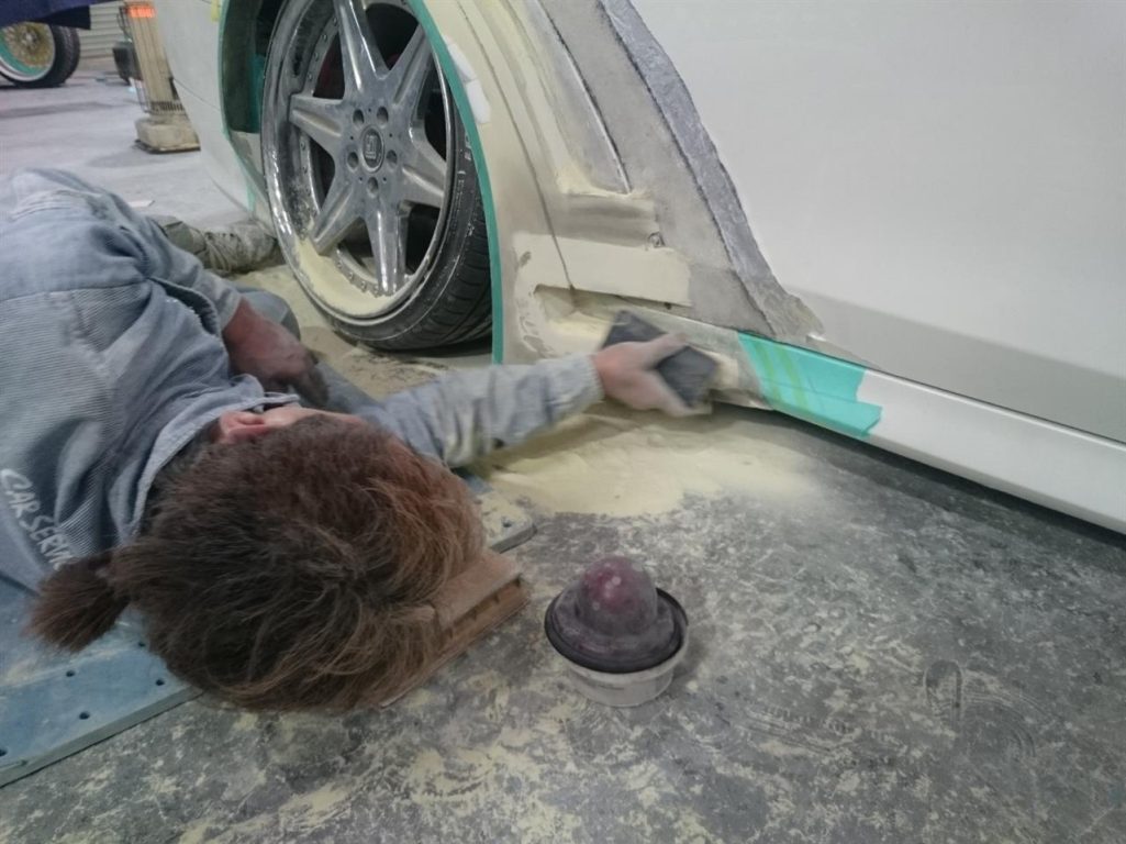 車高が低すぎて、こんな姿勢でパテ研ぎ!!