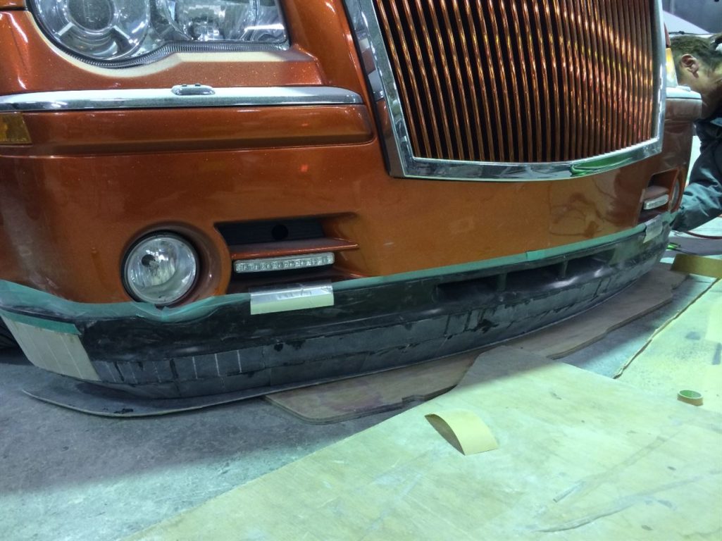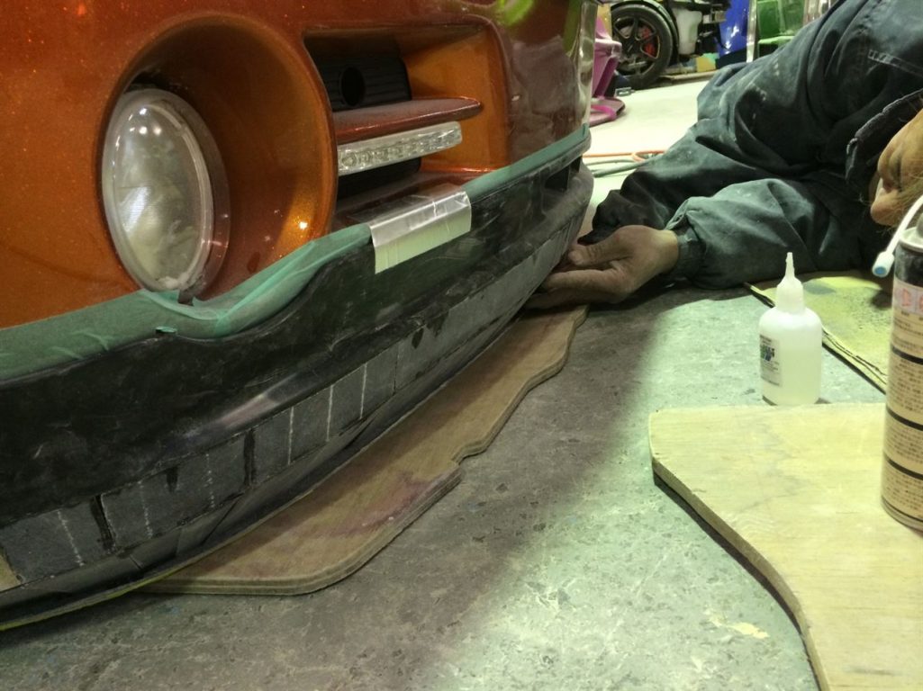 写真が見当たらないのでいきなりですが、市販のFRP製リップをベースに切り張りして延長中!!