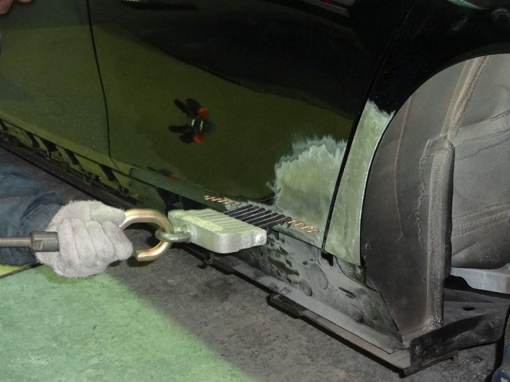 まずはぶつかってしまい引っ込んでしまった鉄板を、専用の工具を使って引っ張り出します!!