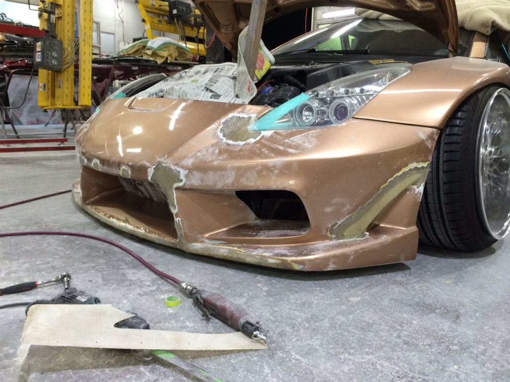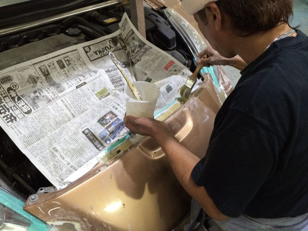 で、さきほどのバンパー取付部分にもファイバーを貼っていきます!